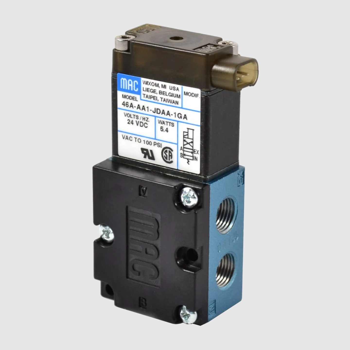 The MAC 46 Series is a direct-operated 4-way solenoid valve. The valve is designed for applications where precision and speed in a small package are essential.