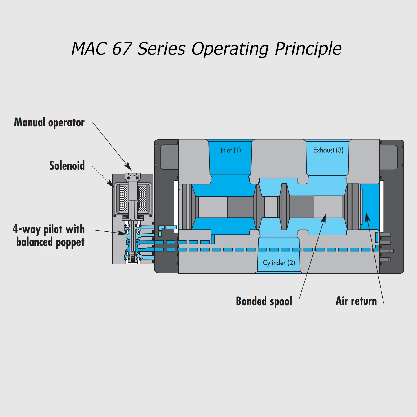 The MAC 67 Series is a 3-way balanced spool valve piloted by a small direct operated 4-way solenoid pilot. The 4-way pilot means a low minimum operating pressure – contains no pistons or springs – and minimal resistance to shifting.  The balanced design in the pilot means shifting forces are consistently high and response times are repeatable regardless of inlet pressure fluctuations.