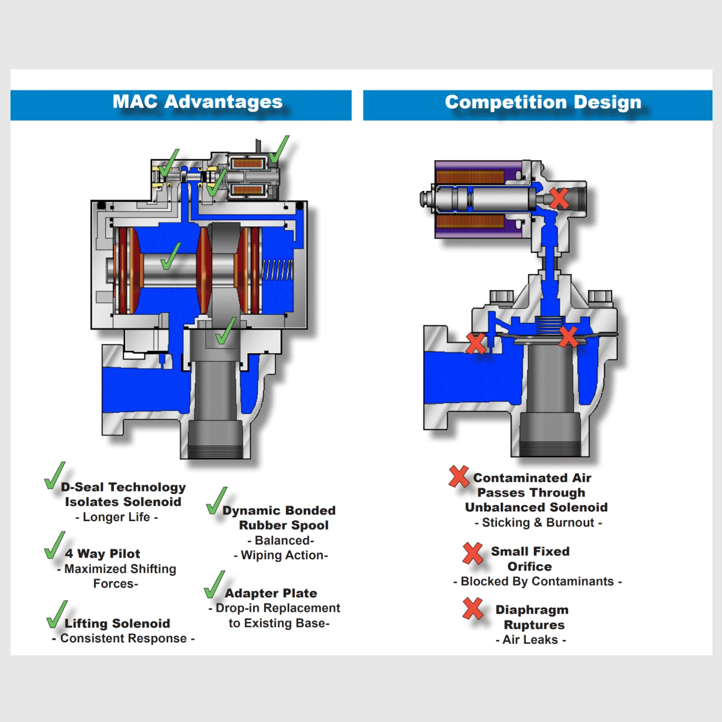 De MAC PV03-serie is ontworpen als directe vervanging voor bestaande puls ventielen (bijv. in stofafscheiders). De MAC-oplossing maakt gebruik van een duurzaam schuif in plaats van het traditionele membraanventiel. MAC gebruikt ook een gebalanceerde stuurventiel die dit ventiel isoleert van verontreiniging in de luchtleiding. Verkrijgbaar met geïntegreerde magneetklep of lucht gestuurd stuurventiel.